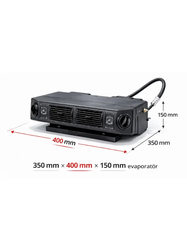 Gizli Elektrikli Klima Seti, araç dış görünümünü bozmadan ve tavan yüksekliğini değiştirmeden soğutma çözümü arayanlar için özel olarak tasarlanmıştır. Yatay 405 evaporatör yapısı sayesinde koltuk altı, torpido arkası veya kabin içi uygun boşluklara gizlenerek estetik bir kullanım sunar.